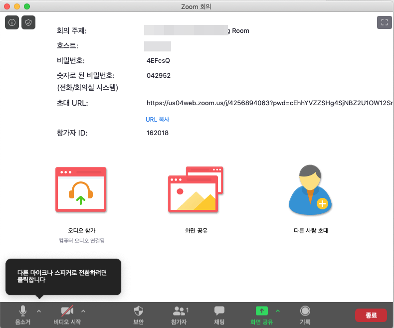 회의를 주관할 때는 위 화면에 표기되어 있는 URL을 공유하면 된다. URL의 뒤에 있는 문자열이 "회의 코드"이다.