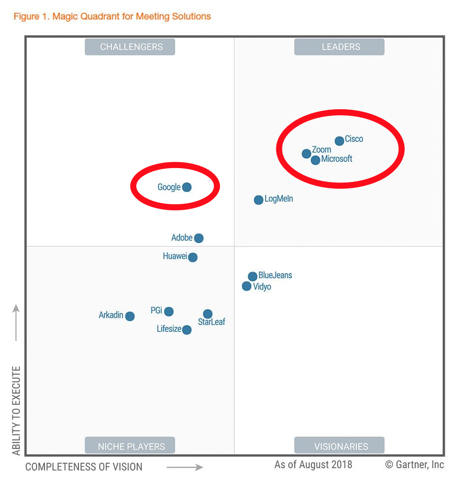 온라인 미팅/화상회의 솔루션에 대한 가트너 매직 쿼드런트 (Magic Quadrant)는 다음과 같다.