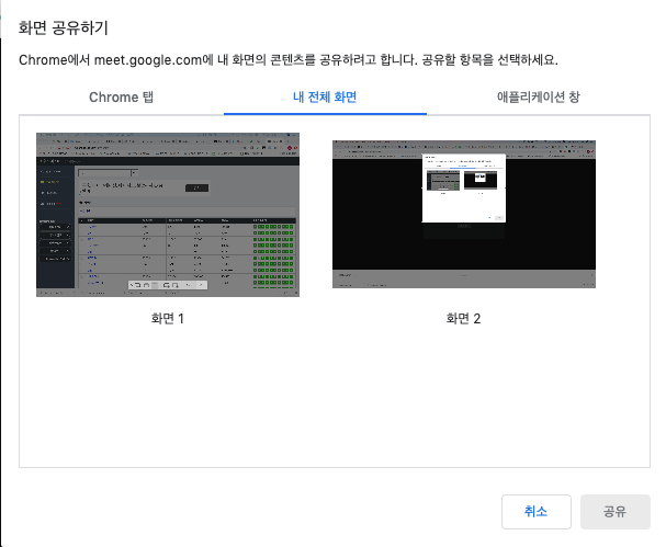 "발표"를 누르면, 본인의 1) 크롬 (Chrome) 브라우저 탭, 2) 화면전체, 3) 애플리케이션 창, 중에서 선택적으로 공유가 가능하다. 이 중 "애플리케이션 창"은 행아웃(HangOut)의 기능과 동일하다.