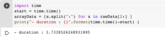 필자가 초기에 데이터를 로딩할 가장 첫 동작중 하나를, 플랫폼 별로 시간비교를 해 보았다. 실제 아래 코드를 실행하였을 때, 소요 시간은 약 2초~4초 사이로 경우에 따라 다른 결과가 나왔다. 바로 재실행 할 경우는 비슷한 실행 시간 결과가 나오고, 몇시간 지나서 실행을 하면 다른 결과가 나온점을 미루어 볼 때, 자원 공유로 타사용자가 얼마나 리소스를 사용하느냐에 따라서 다른것으로 추정된다.