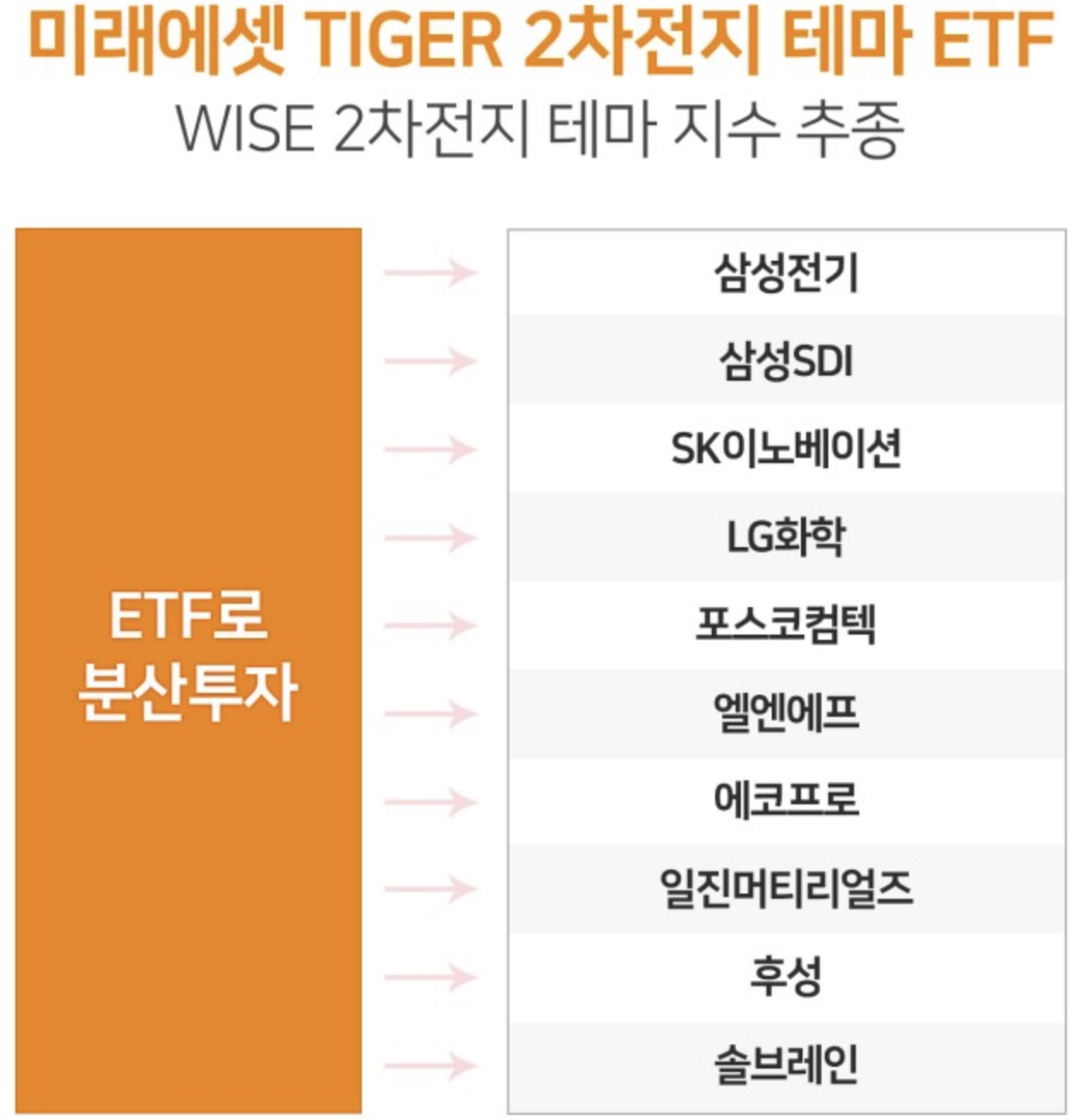 대표적으로, 미래에셋의 TIGER 2차전지테마 ETF 로 예를 들 수 있다.