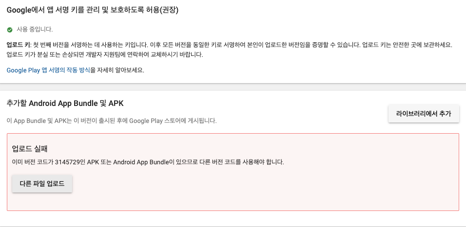 실제로 구글 Playstore에 앱을 업로드 하면서 이것저거 수정하다 보면, 아래와 같이 앱의 버전이 이미 업로드 되어 있으므로 앱 버전을 수정하라는 가이드를 보게 된다.