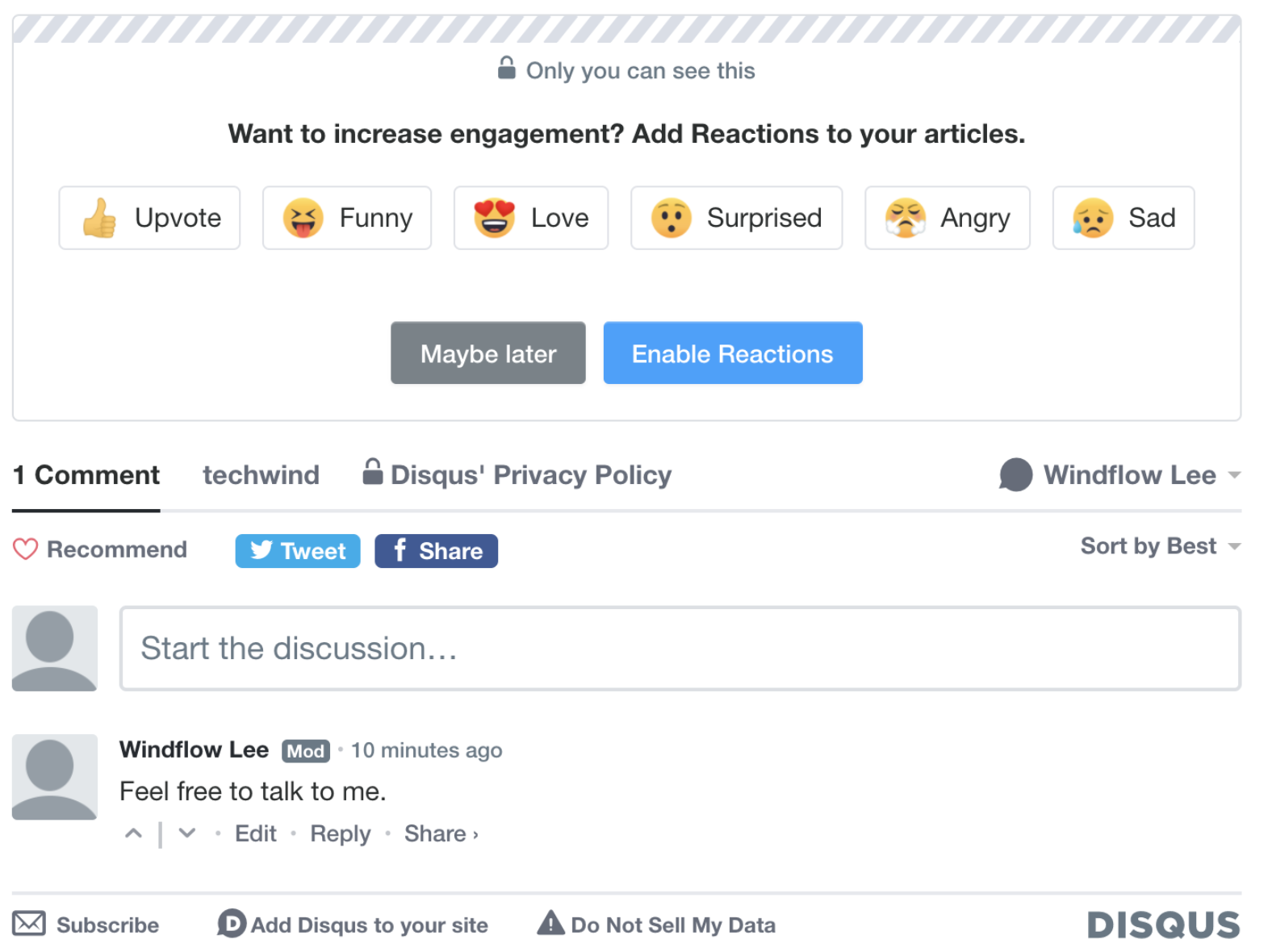 여하튼, Gatsby에서는 Disqus에 대한 플러그인을 별도로 제공되고 있으며 유사 서비스중 가장 익숙하므로 Disqus가 무난하다 하겠다. 아래는 이번 글에서 목표로 하는 최종 아웃풋이다. 정적웹사이트 블로그에 Disus 댓글 기능을 추가하는 것이 목표이다.