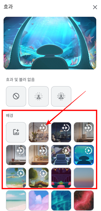 배경 영역에서 몇개를 살펴보면, 각 배경의 우측 상단에 세모(Play 아이콘)이 표시되어 있는 것들이 존재하는데, 이 배경들이 움직이는 배경이라 보면 된다. 기존의 일반 사진을 배경으로 적용하는 것과 완벽하게 동일하다. (컨텍츠 선택만 차이가 있을 뿐이다.)
