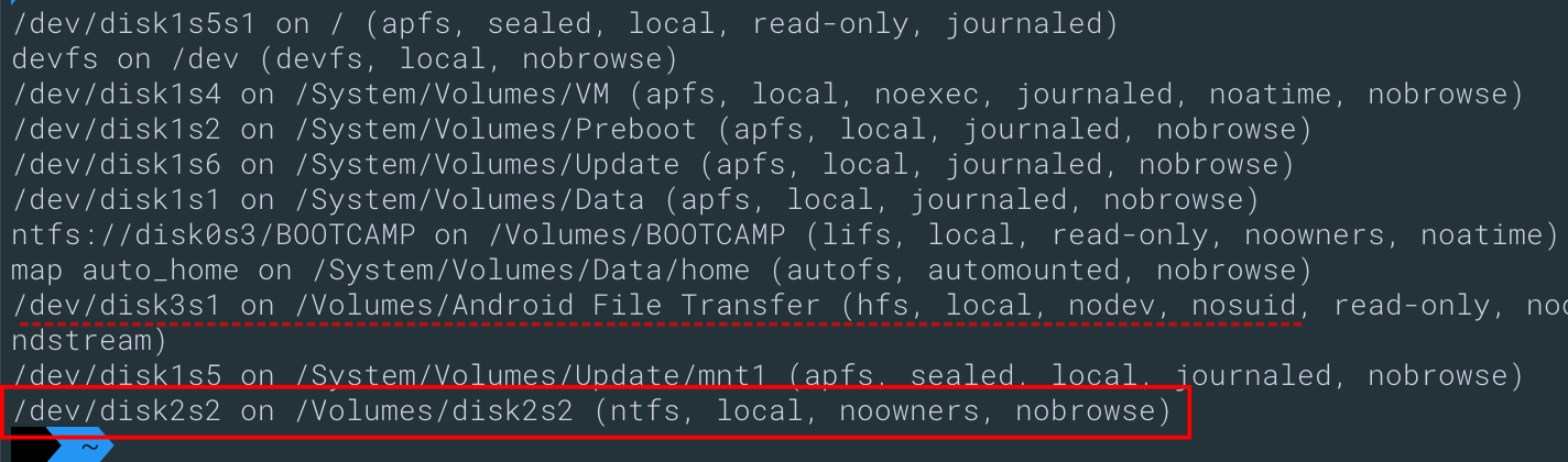 마운트 된 결과를 확인해 보자:  `mount`를 실행해 보면 마운트가 결려있는 정보를 나열해 준다. 결과를 확인해 보면 `/dev/disk2s2`가 마운트 되어 있음을 확인할 수 있다. 또한, 이전에 소개한적 있던 안드로이드 (Android)에 파일을 전송하는 애플리케이션 또한 유사한 방법으로 마운트가 걸려 있는 것을 알수 있다.