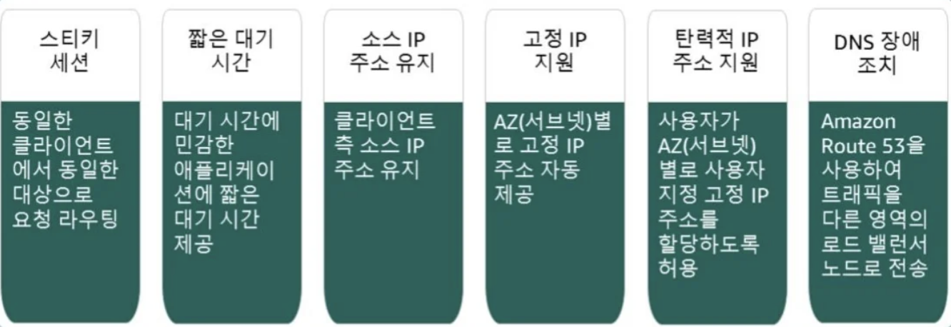 Application Load Balancer (L7) 부하 분산으로 지원하는 기능 (좌), Network Load Balancer 부하분산 지원 기능 (우)로드 밸런서의 종류별 차이에 대한 도식화