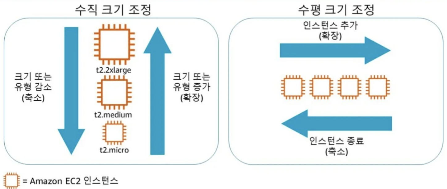 크기 조정 (Auto Scaling) : 수직 크기 조정, 수평크기 조정. Amazon Auto Scaling은 수평 크기 조정을 의미함. Auto Scaling 그룹의 예 (우) : 처음에는 3개 인스턴스로 시작, 트래픽이 작으면 2개로 줄이고, 트래픽이 많으면 5개로 증대.