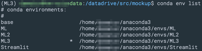 `conda env list`를 실행하면 가상환경 리스트를 확인할 수 있는데, 설치된 가상 환경의 directory 위치를 확인 할 수 있다.