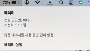 상단의 메뉴바를 클릭하면 배터리 설정이 나오는데, 여기에서 "배터리 설정..."을 클릭해도 위의 배터리 메뉴가 열리게 됩니다. "퍼센트 보기"는 어디로 갔을까??