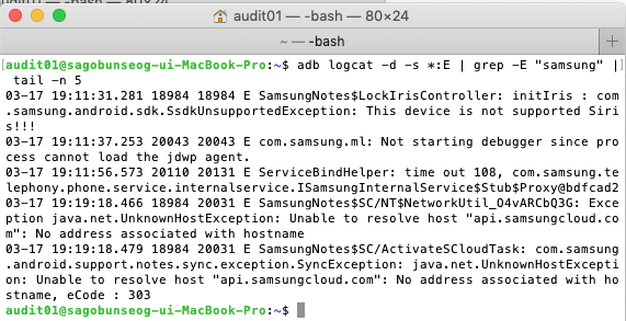 adb logcat -d -s *:E | grep -E "samsung" | tail -n 5