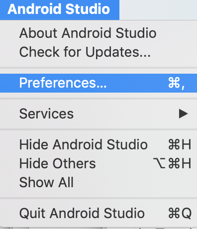 1) 우선 첫번째 안드로이드 스튜디오 경로를 찾기 위해서, 안드로이드 슈튜디오 메인 메뉴에서의 Preferences... 메뉴로 들어 갑니다.