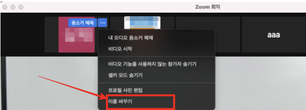 온라인 회의 특징 상, 화면이 비춰지고 있는 상황에서 이름 변경 메뉴가 쉽사리 눈에 들어오지 않는다.